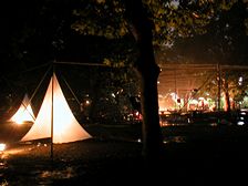 宮城 聰 ク・ナウカなる劇団が日比谷公園でサロメをやるのでどう?という誘いを受けた。 西洋演劇にはほとんど興味のないのですが、野外と言うことで行ってみることに。 調べてみるとク・ナウカは宮城聰の劇団。なつかしい名前を聞いてしまった。シティボーイズというかラジガジ絡みの宮沢章夫チェックしていたから宮沢&宮城のカニは横に歩くなんかを観に行った記憶が。。。 あの当時から演劇言語やマナーを割と守るのでちょっと堅苦しさを感じてしまう人だったのですが、10年という年月でどう変わったのかなぁという期待というかセンチメンタリズムを持って臨む。 当日は大雨でこの中でやるかよ〜〜〜大変だなぁと裏方さんのことを心配してしまう。まだまだ大道具やってた感覚が抜けない自分に苦笑い。 日比谷公園の草地広場という子供が向けの遊具が点在する林の一角の小山を舞台にスタンド席が扇形に展開。空中にクモの巣を模したワイヤーが張り巡らされて何かを期待させる感じ。 入場の段取りの悪さが嫌な予感。開けて二日目だからか。予想以上の大雨のためか。 妙に芝居がかったギャルソンがビニールや酒・茶などをサーブしてくれる。 と、突然芝居が始まる。ギャルソン達が役者だった。 芝居の中味はまねきねこさんにまかせるとして、、、 日暮れとともに暗くなってゆく林の闇を借景にした舞台装置はナイス! 音響は最低。素人がやっているとしか思えないひどいレベル。 芝居そのものが演者とその後ろに並んだ語り部という面白い構成(これが浄瑠璃の手法を使ったク・ナウカのスタイルらしい)なので肝心の語り部の声が拾えないため芝居に集中できない。 SEは林の中から出して、演者の声は客席前にコロガシかなにかで出すべきだとおもう。 というか、この自然を舞台として使うなら生声でいって欲しいところ。 PA通して芝居臭いうわずった声をずっと聞かされるのはつらい。 役者もいろんな被り物して現れて、さながらコスプレ大会。 イコンなどもいまいち意味が掴めず、雨ということで芝居も堅く、客も堅く盛り上がらずに終わった感じ。 大学時代に付き合いで顔出していた劇研のいくつかのユニットの芝居を思い出してしまった。学生のときからずっと変わらずこんなことやっていていいのかい?っていう苦笑いしかない代物でした。 僕のように芝居言語を知らない人(もちろん大道具や舞監補佐として立ち会った舞台の数はたくさんありますが、淡々とこなすだけで芝居人との付き合いもしなかった)にとっては辛いの一言。 日本で劇団四季しか経済にならないのも分かる気がする。